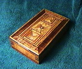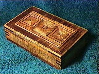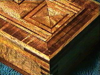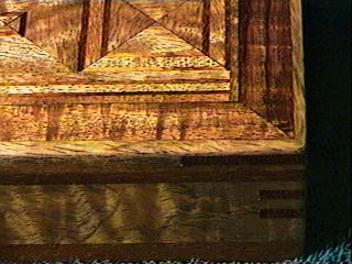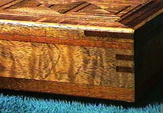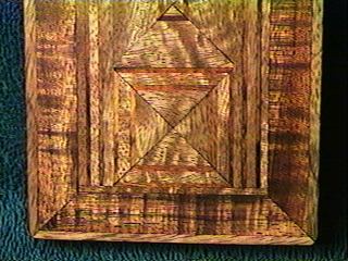 This box had a lesson in turning mistakes to an advantage. I had originally planned to the top to be a plainer twin-paneled mango medallion, (similar in design to numbers five and seven). However, not once but twice I made boneheaded mistakes in the course of mitring the four "frame" pieces that would go around the outside of the top. This left me with the long laminted strips from these attempts, and I noticed, while fooling around with the little waste triangles from cutting the mitres, that they could be fitted together to for squares with an atrractive contrast between the thin strips of koa and the mango. So, a mid-course correction changes then plan for the top, with the results you see here. Serendipity.
