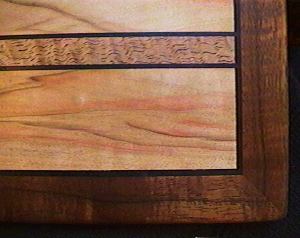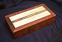 This is the second Timonthy Lydgate box we bought, from Fine Woods of Carmel in Monterey, California in September 1997. The box was quickly recognzable as one of Timothy's to us. The top features a pair of book-matched willow panels, separated by a thin strip of light (sapwood?) koa, framed in a darker heartwood koa, all articulated by thin strips of very black rosewood. The body is the made of the same darker koa, with a thin rosewood strip atop the sides. Rosewood slipfeathers in the corners.